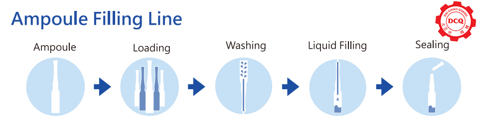 Continuous Operation Process: The system sequentially and automatically performs: Empty Ampoule Feeding ➔ Ultrasonic Washing ➔ Liquid Filling ➔ Flame Sealing.